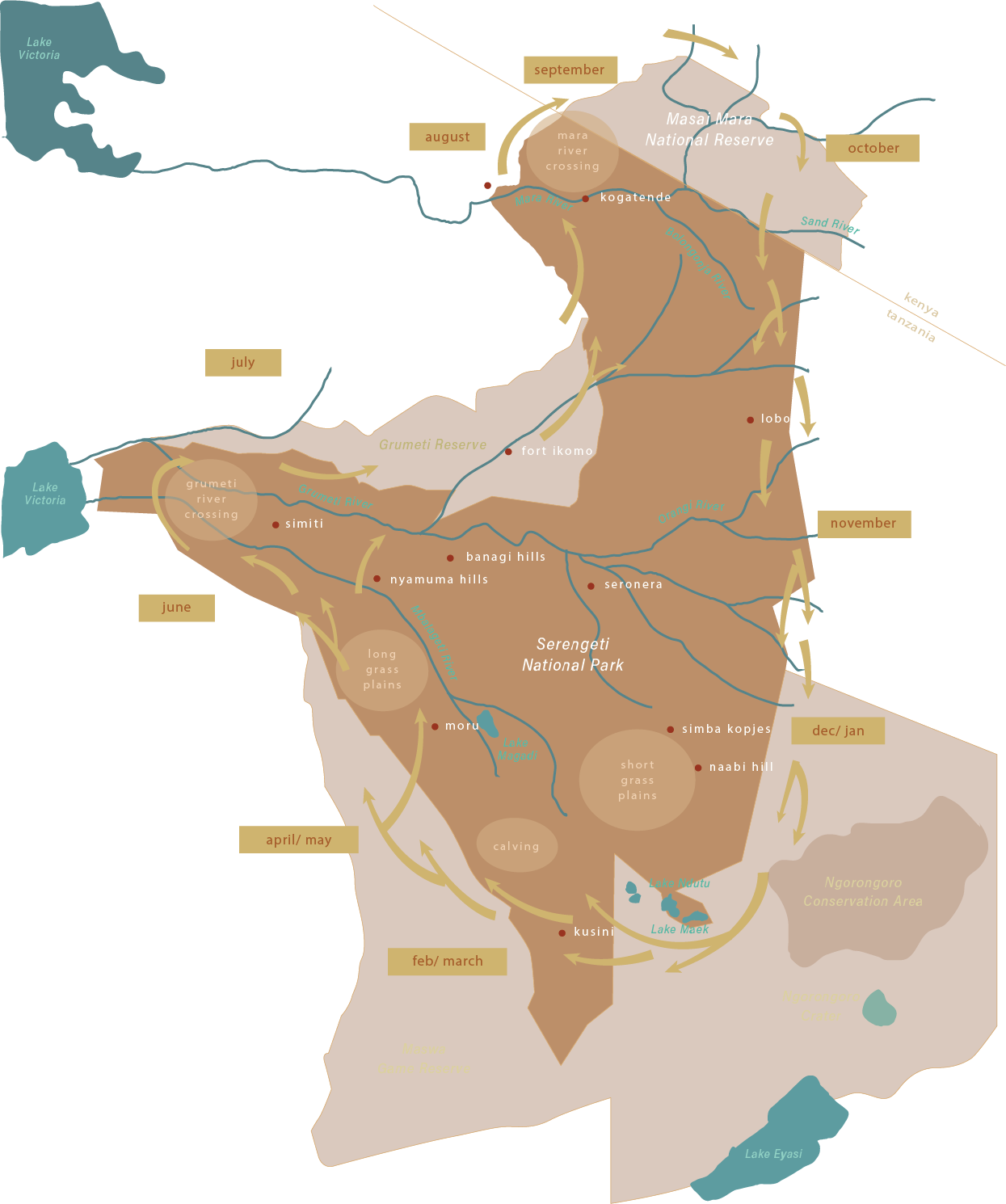 The migration moves through a defined circuit across the Serengeti National Park, the Ngorongoro Conservation Area, the Loliondo Game Controlled Area and the Grumeti Reserve in Tanzania, to the Masai Mara Game Reserve in Kenya.